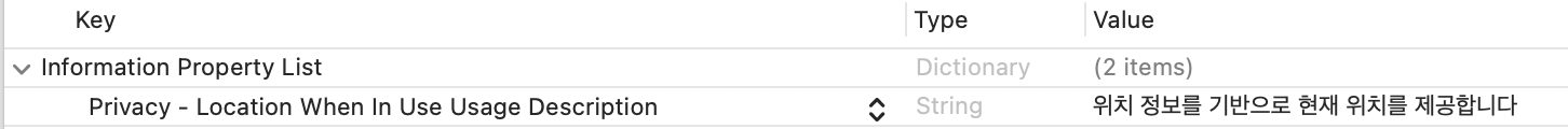 Info.plist파일에 가서 프로퍼티 리스트에 "Privacy - Location When In Use Usage Description"를 추가한다.