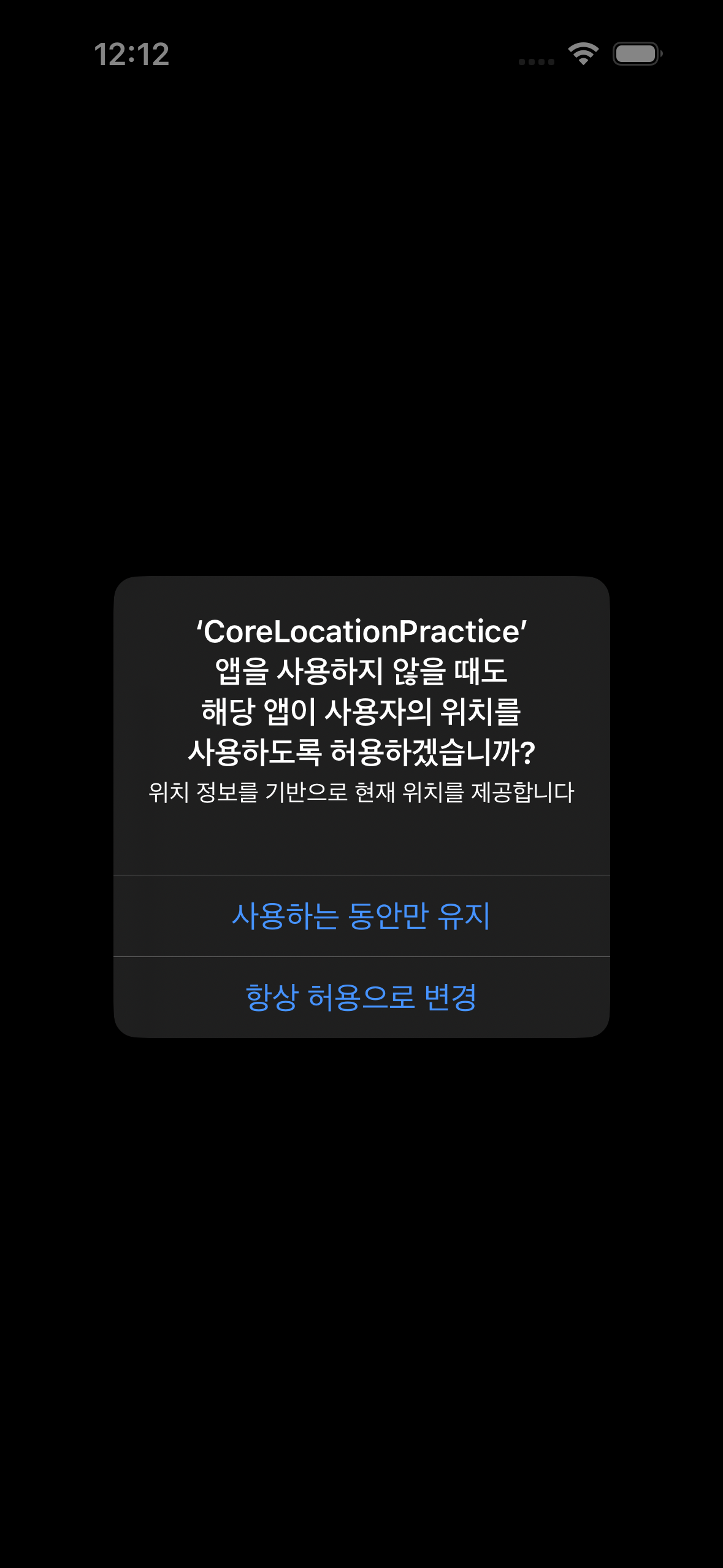이후 CoreLocation의 위치정보를 이용하기 위해 사용하는 CLLocationManager 인스턴스에서 "requestWhenInUseAuthorization" 메소드를 호출해주면 된다.