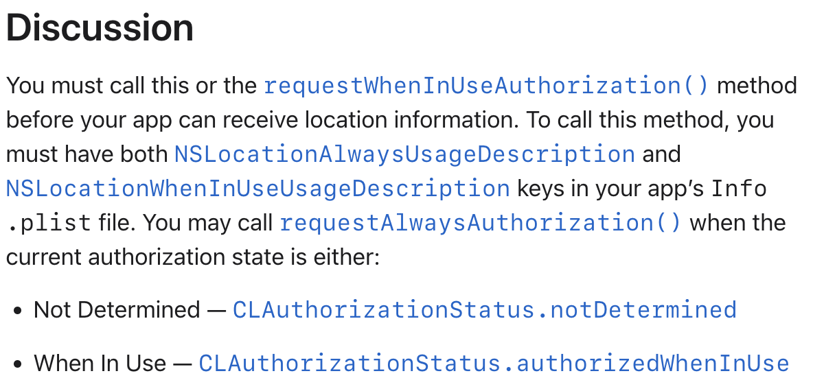 - requestAlwaysAuthorization 문서를 보다보면 아래와 같이 NSLocationAlwaysUsageDescription에 대한 언급이 있다. 내 글을 보고 Info.plist에 프로퍼티를 넣으면 상관 없지만, 문서를 보고 혼동이 올 수 있다. "NSLocationAlwaysUsageDescription" 프로퍼티는 Depreacated되어 사용할 필요가 없다.