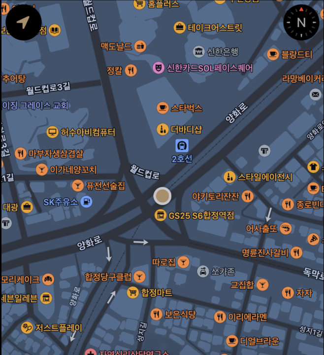 Custom Location 클릭 후 특정 좌표를 입력하면 시뮬레이터의 위치로 설정된다. 아래는 합정역의 좌표를 입력했을 때 시뮬레이터 상에 표시되는 지도이다.