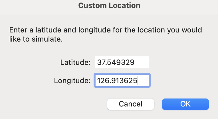 위치 정보를 테스트하기 위해 시뮬레이터에 구동했는데 나의 물리적 위치가 아닌 바다 한복판이라든지, 미국 어딘가를 보여줄 수도 있다.