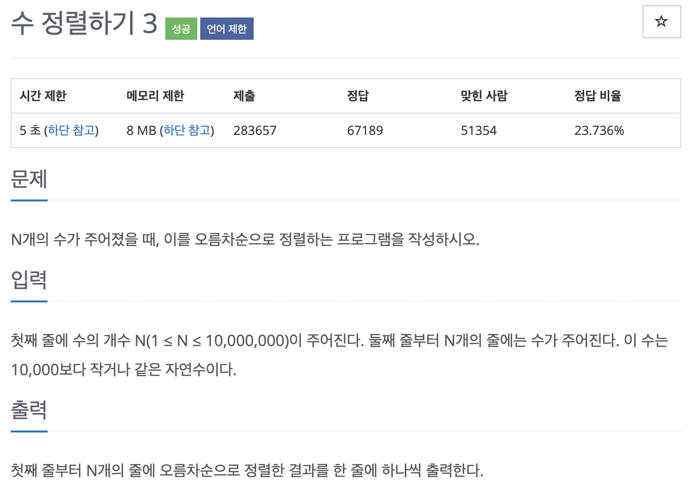 문제 https://www.acmicpc.net/problem/10989 10989번: 수 정렬하기 3 첫째 줄에 수의 개수 N(1 ≤ N ≤ 10,000,000)이 주어진다. 둘째 줄부터 N개의 줄에는 수가 주어진다. 이 수는 10,000보다 작거나 같은 자연수이