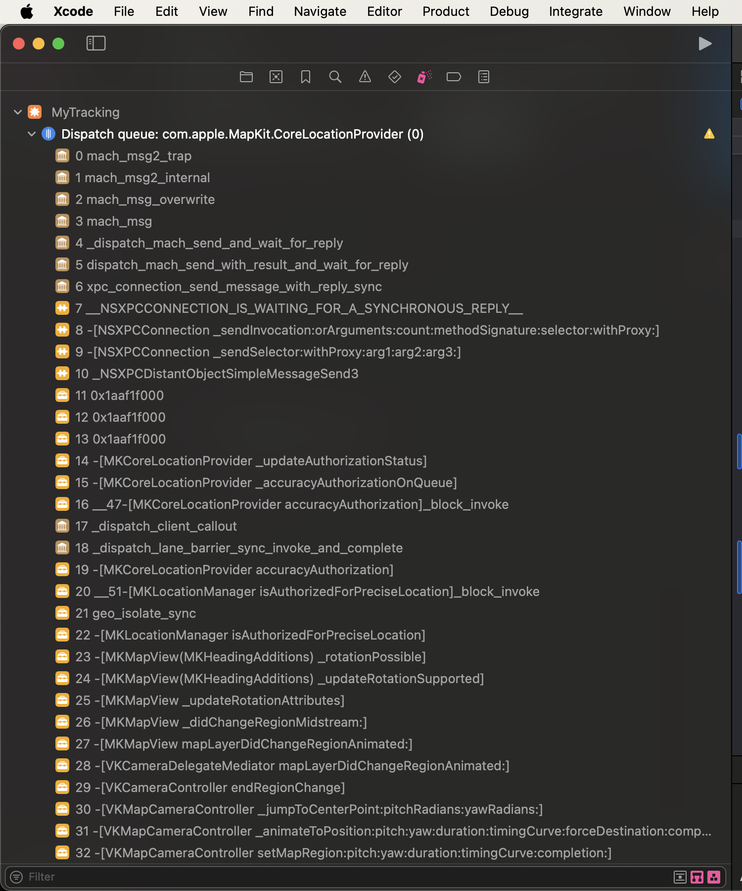 Debug Navigator를 통해 크래시가 발생한 당시의 스레드가 symbolicate 된것을 확인할 수 있다