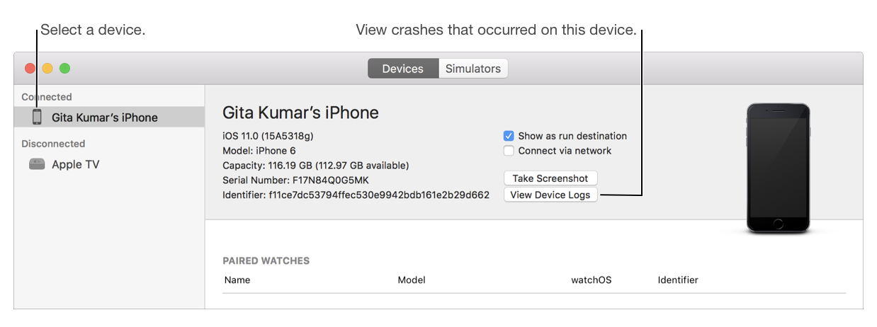 View Device Logs 버튼을 통해 크래시 로그들을 symbolicate하여 볼 수 있다