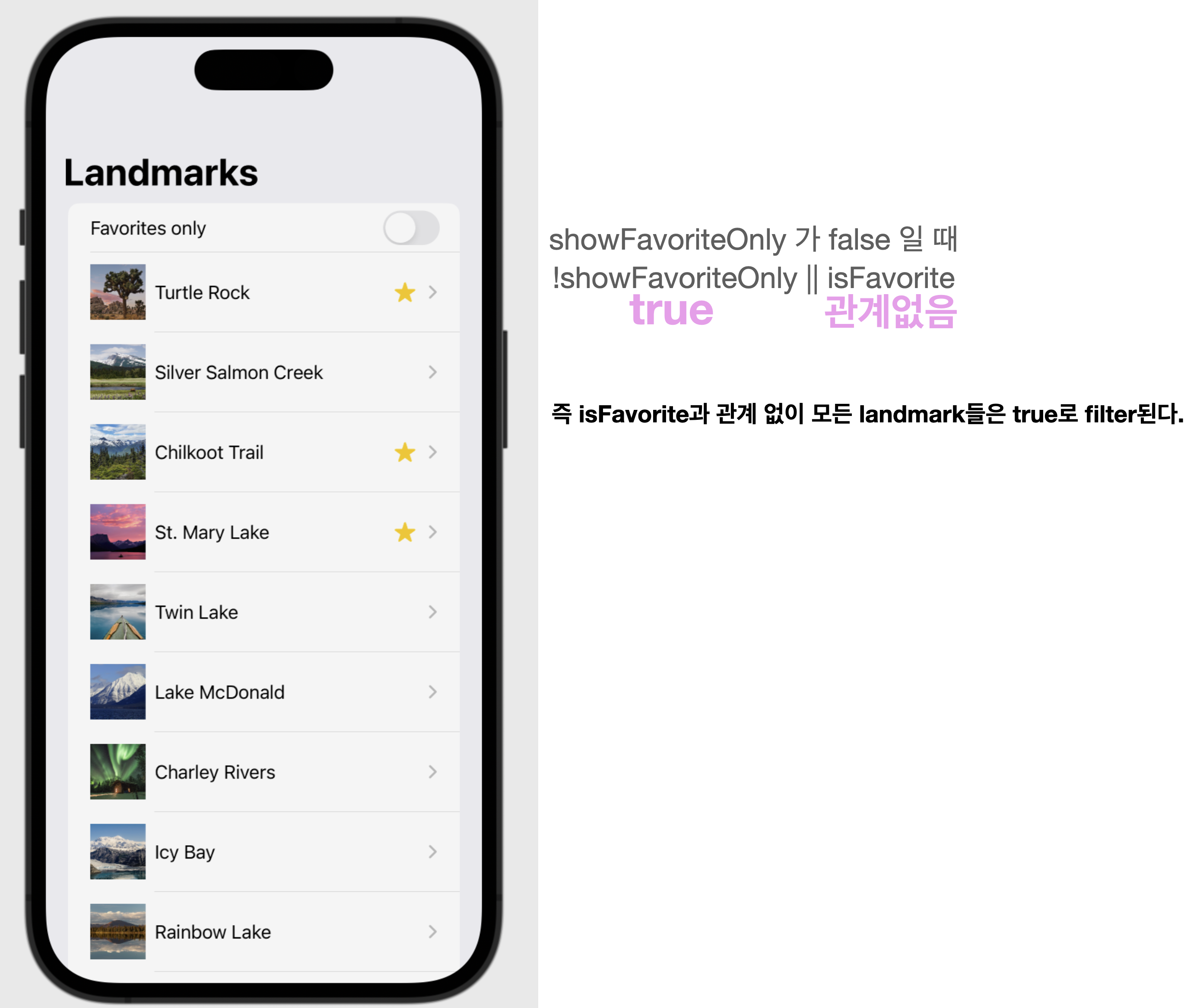 근데 showFavoriteOnly 값은 landmark와 전혀 상관이 없는데 어떻게 얘에 따라서 landmark를 리스트에 보여주는 조건을 좌지우지하냐가 이해하기 어려웠다.